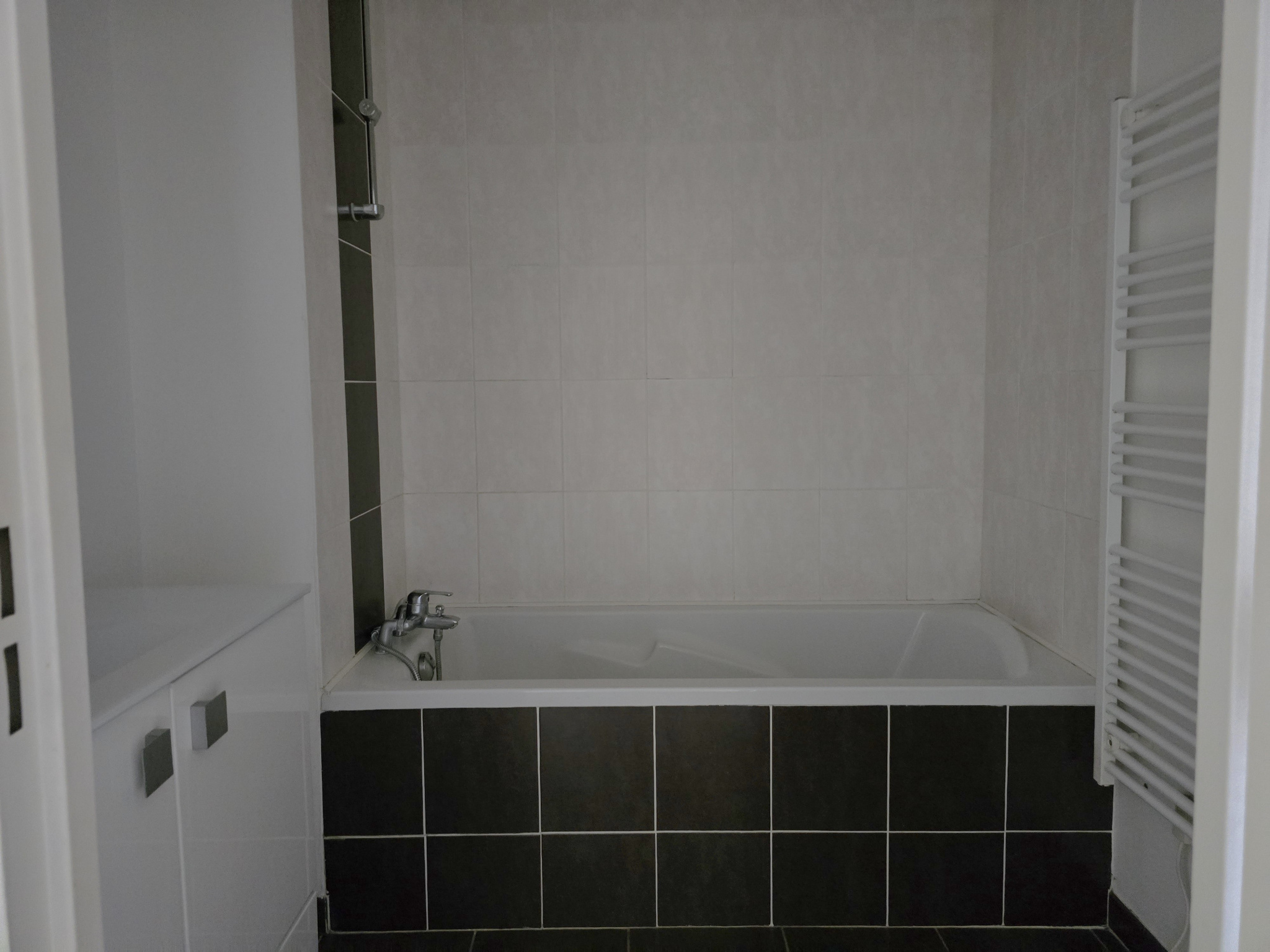 -Une salle de bains avec baignoire et espace discret pour la machine à laver,