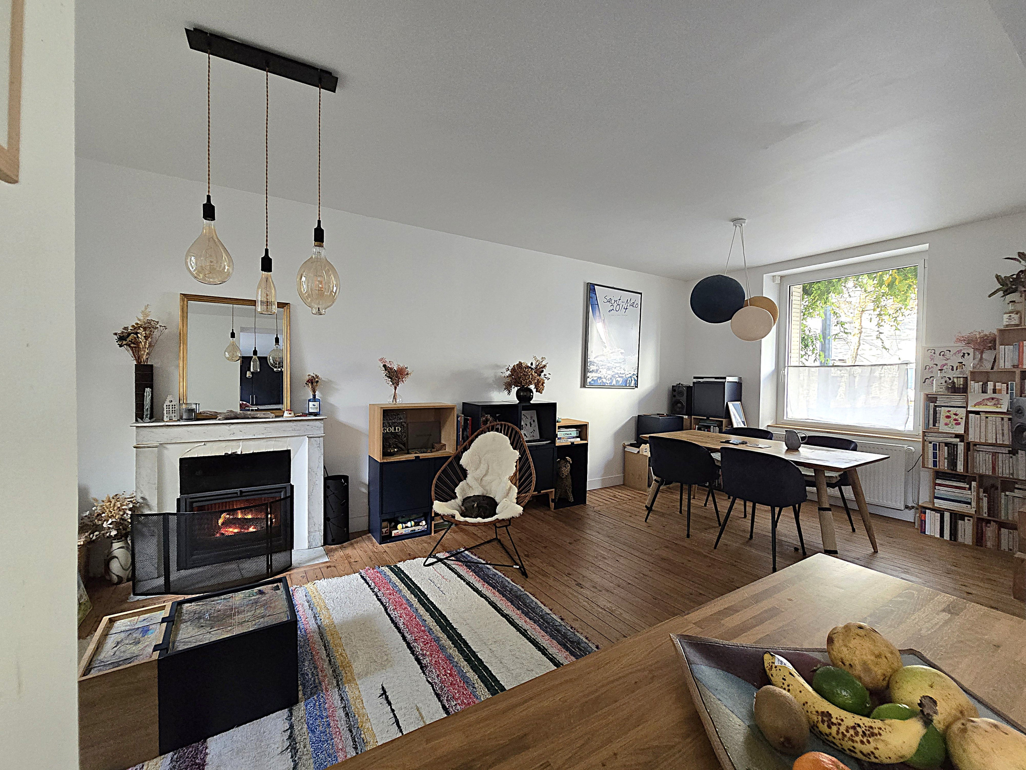 une pièce de vie traversante, lumineuse et chaleureuse, sur parquet ancien, offrant un coin cheminée cosy et un espace repas permettant d’accueillir une grande table conviviale