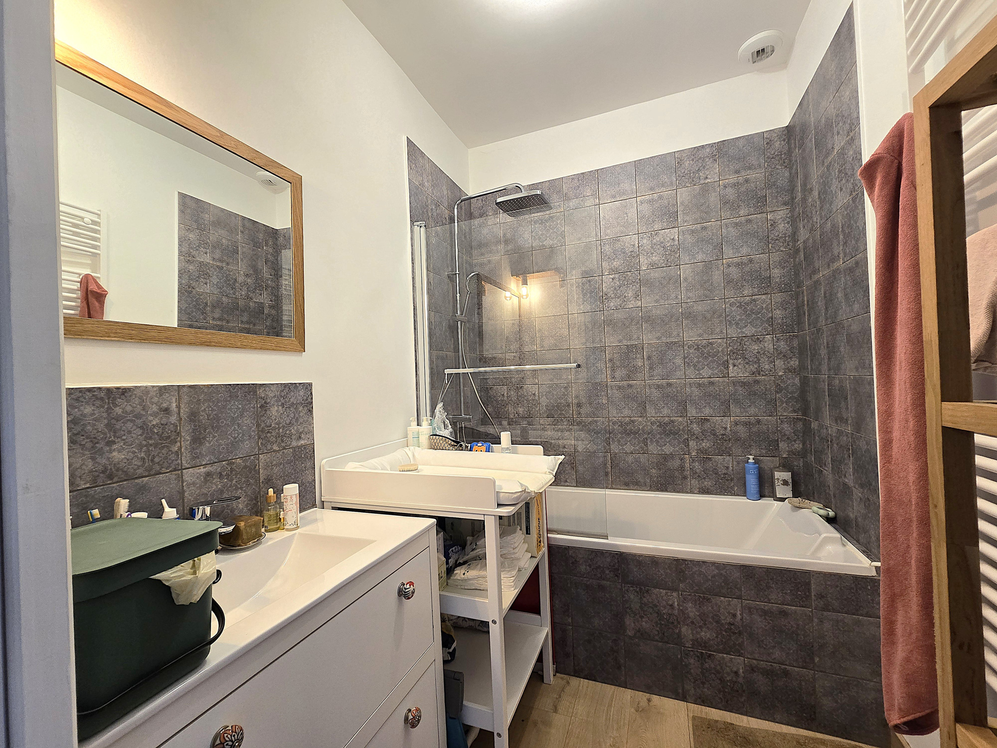 une salle de bain avec baignoire, accessible depuis le palier, pratique pour toute la famille